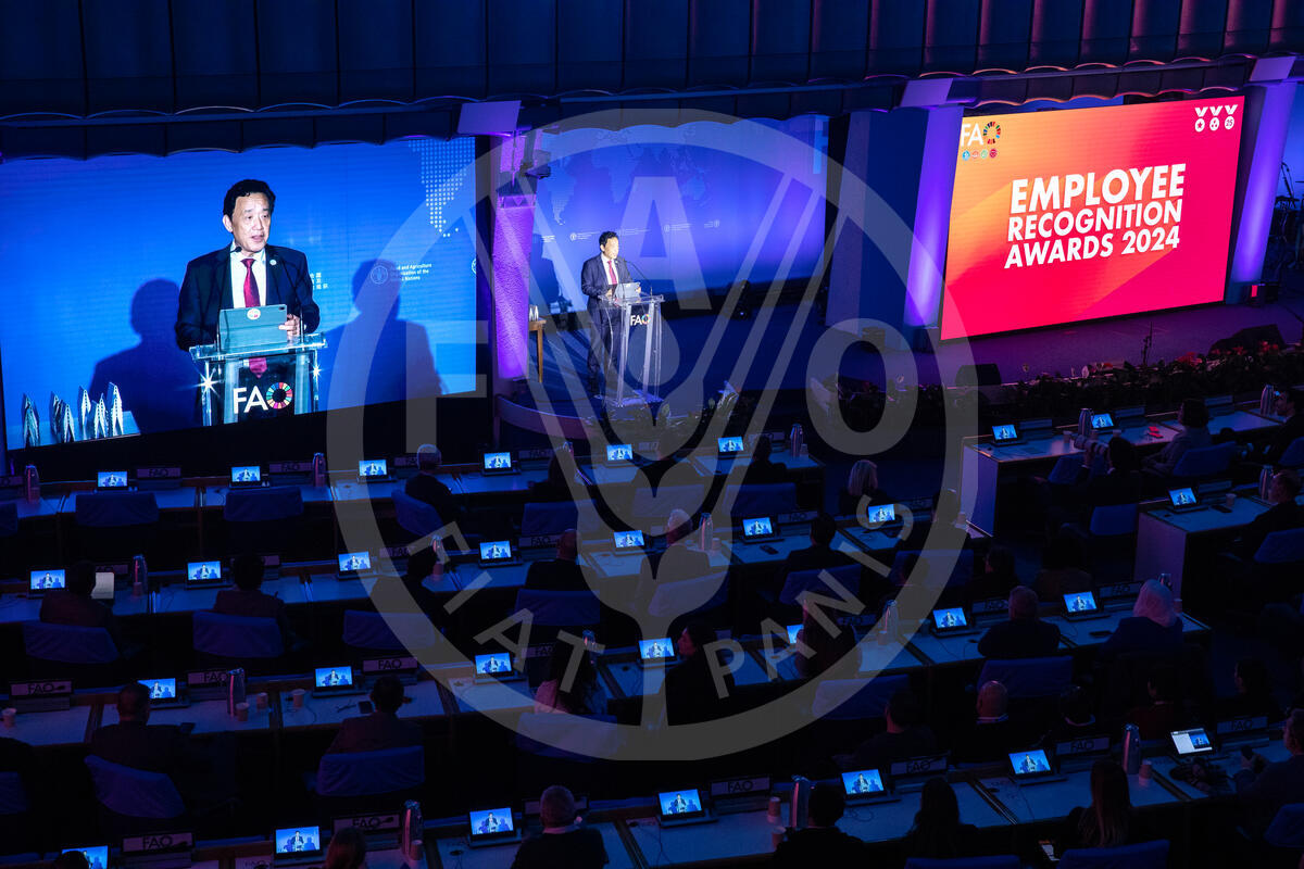 19 December 2024. Rome, Italy. FAO Director-General QU Dongyu delivers his speech on occasion of the sixth edition of the Employee Recognition Awards (ERA) 2024. FAO Headquarters, (Plenary Hall).