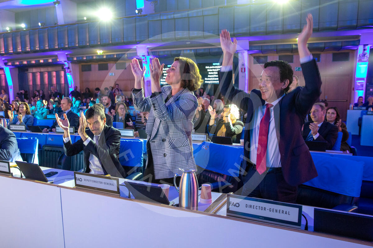 19 December 2024. Rome, Italy. FAO Director-General QU Dongyu, right, next to Beth Bechdol, FAO Deputy Director-General, FAO Deputy Director-General Maurizio Martina claps during the sixth edition of the Employee Recognition Awards (ERA) 2024. FAO Headquarters, (Plenary Hall).