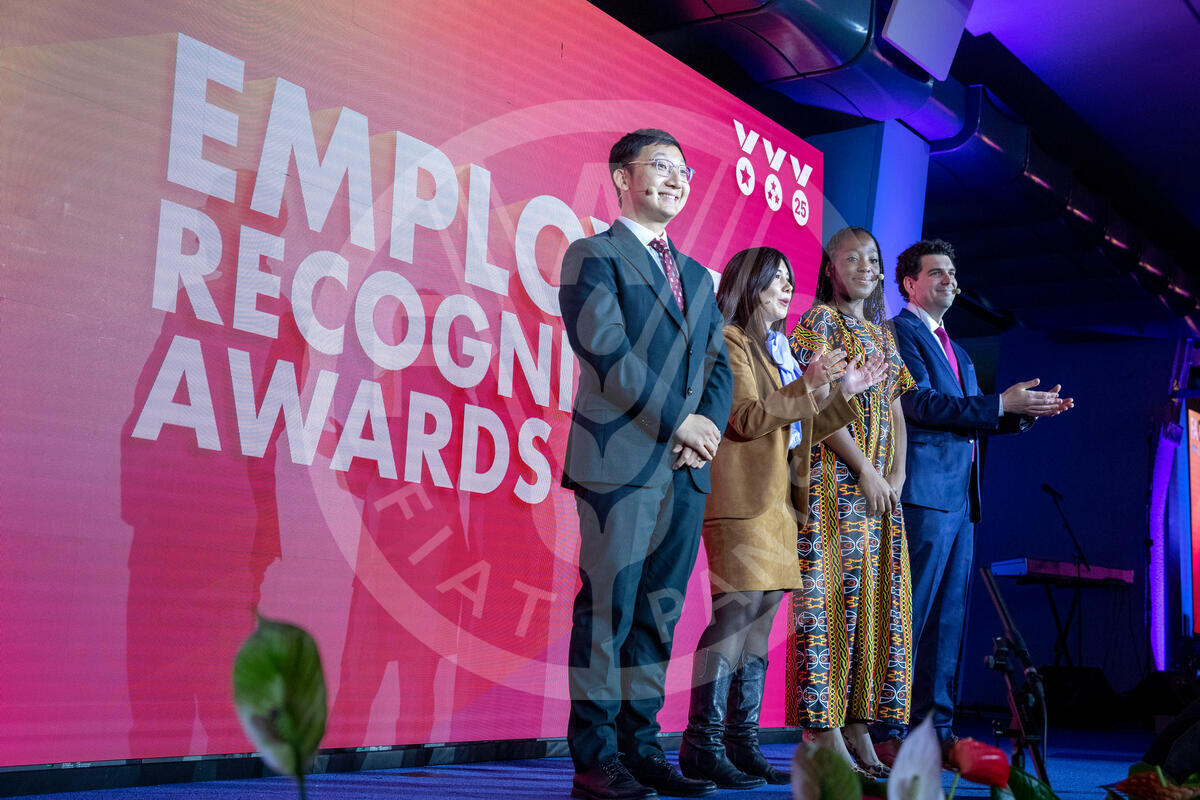 19 December 2024. Rome, Italy. From left, Ruobin Wu, Soraya Sadeghi, Nakita Aboya, Carlos Fuentevilla during the sixth edition of the Employee Recognition Awards (ERA) 2024. FAO Headquarters, (Plenary Hall).
