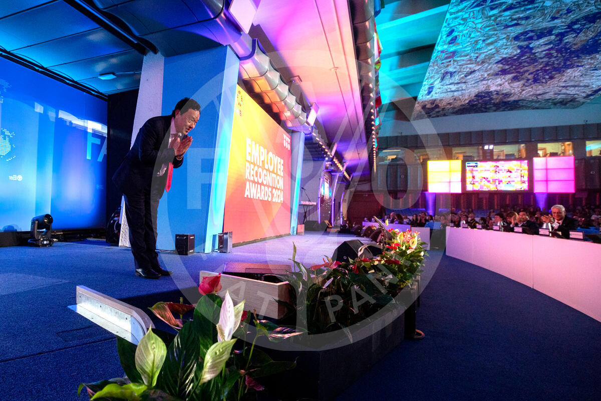 19 December 2024. Rome, Italy. FAO Director-General QU Dongyu greets the audience of the sixth edition of the Employee Recognition Awards (ERA) 2024. FAO Headquarters, (Plenary Hall).