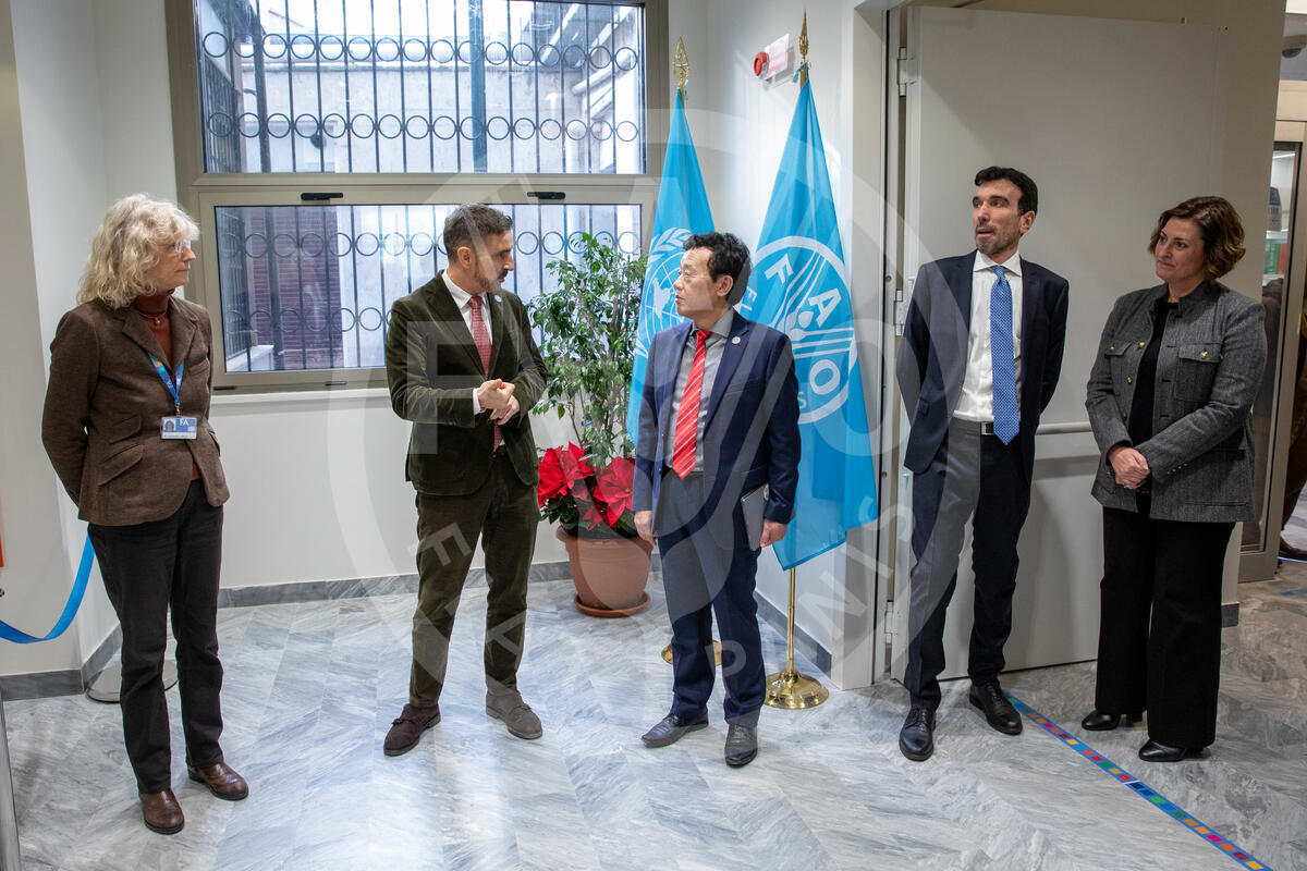 18 December 2024. Rome, Italy. From left, Tina Mittendorf, FAO Senior Facilities Management Officer, Rodrigo De La Puerta, FAO Director CLSD, FAO Director-General QU Dongyu, FAO Deputy Director-General Maurizio Martina, and Beth Bechdol, FAO Deputy Director-General, during the inauguration of FAO Building C after renovation works. FAO headquarters (Building C).