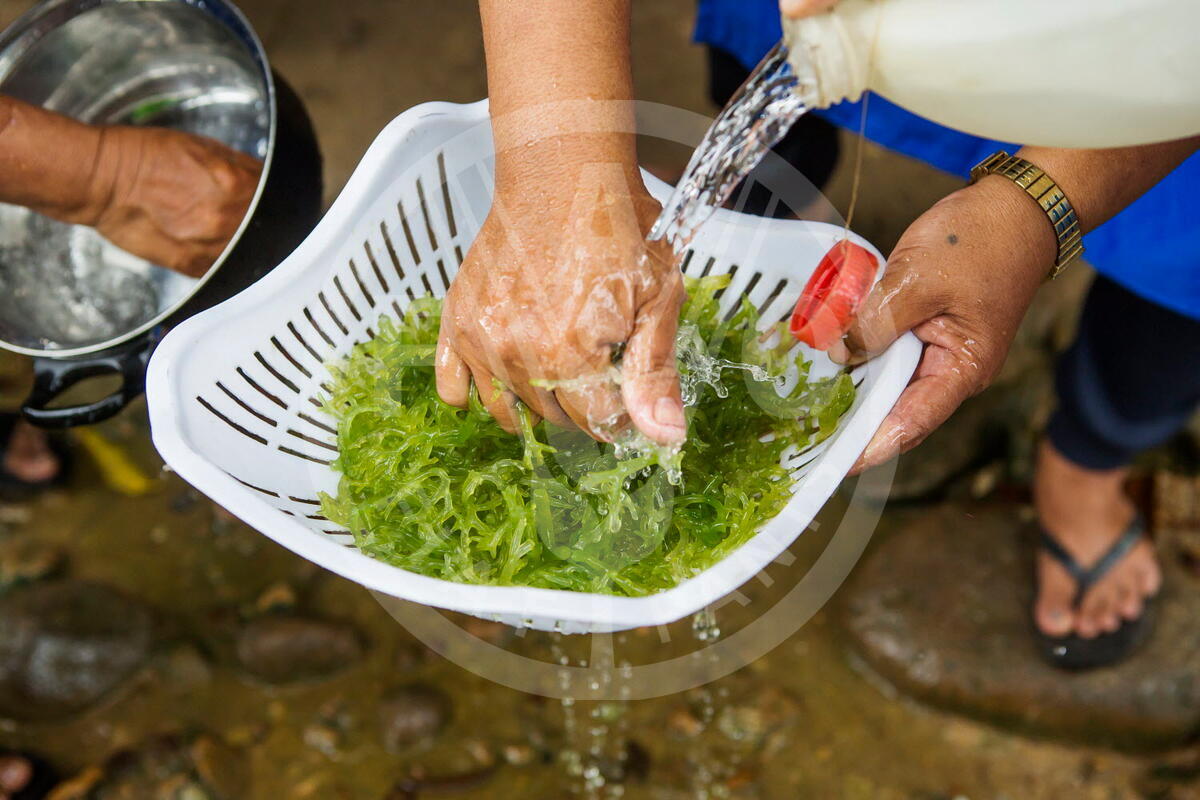 16 March 2022, Sibutad, Zamboanga del Norte, Philippines - Local women of this small fishing community in Barangay Calube has started making pickled seaweed and selling it. It's a new endeavor for them as they would normally eat the seaweed fresh. The recipe and startup funds came from BFAR.