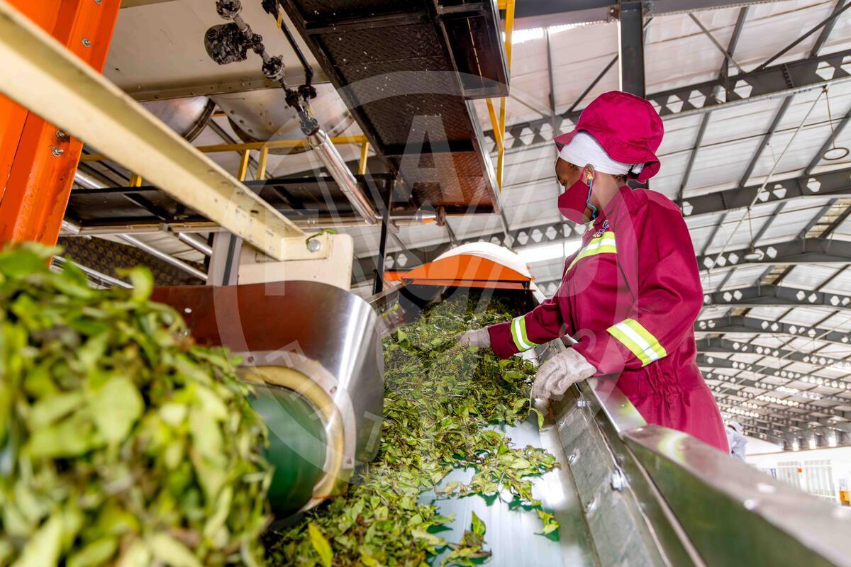 26 September 2025. Rwanda. Field missions across Rwanda’s tea-growing districts engaged farmers, cooperatives, and factory managers to inform a more inclusive and evidence-based national strategy. Shows factory workers processing the just-picked tea leaves.