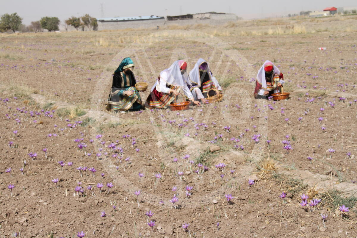 15 October 2025. Khorasan Razavi Province, Islamic Republic of Iran. Women in traditional attire harvesting saffron flowers in the fields.