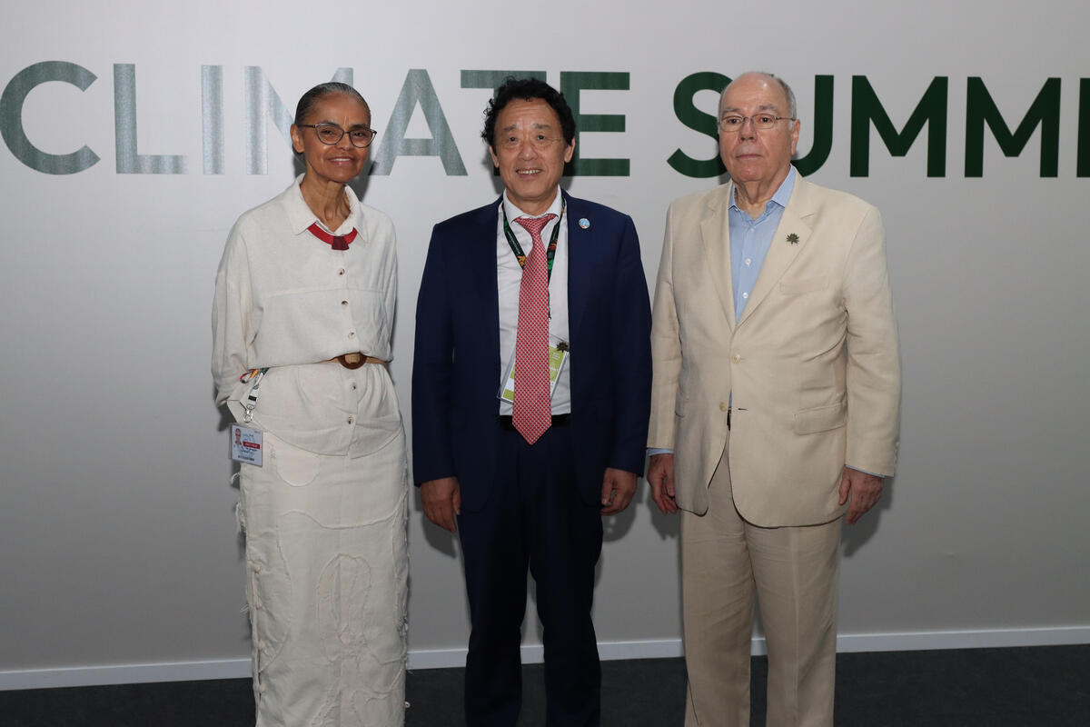 06 November 2025. Belém, Brazil. FAO Director-General QU Dongyu (C) is welcomed at the COP30 Leaders' Summit by Mauro Vieira (R), Minister of Foreign Affairs of Brazil, and the Minister of the Environment and Climate Change of Brazil, Marina Silva (L). World leaders are gathering in Belém, Brazil, for the climate summit on 6 and 7 November, kicking off the 30th United Nations Climate Change Conference (COP30).