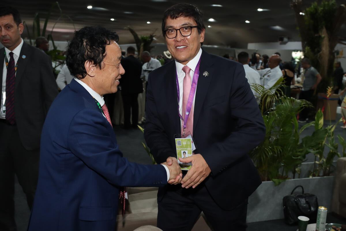 06 November 2025. Belém, Brazil. FAO Director-General QU Dongyu (L) with Edil Baisalov (R), Deputy Chair of the Cabinet of Ministers of Kyrgystan. World leaders are gathering in Belém, Brazil, for the climate summit on 6 and 7 November, kicking off the 30th United Nations Climate Change Conference (COP30).