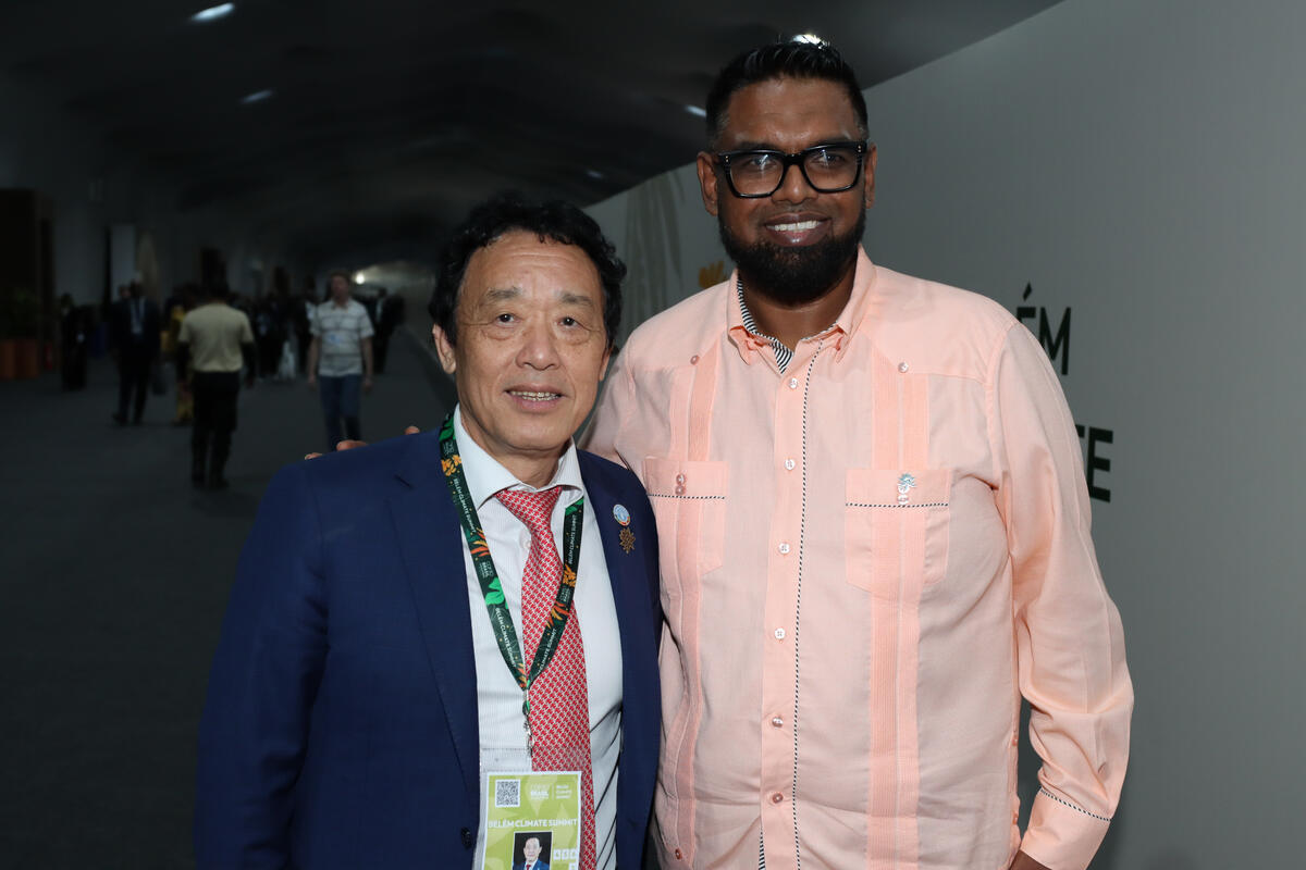 06 November 2025. Belém, Brazil. FAO Director-General QU Dongyu (L) with President of Guyana, Irfaan Ali (R). World leaders are gathering in Belém, Brazil, for the climate summit on 6 and 7 November, kicking off the 30th United Nations Climate Change Conference (COP30).