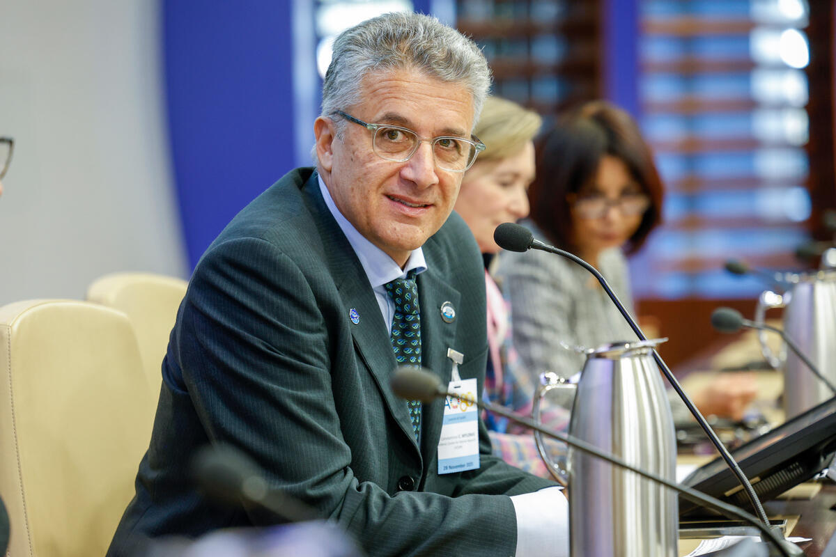 28 November 2025, Rome, Italy. Constantinos C. Mylonas, Director, Institute of Marine Biology, Biotechnology and Aquaculture, Hellenic Centre for Marine Research, Greece, delivers his address during the launch event of the 2025 edition of “The State of Mediterranean and Black Sea Fisheries (SoMFi)”. FAO Headquarters (Sheikh Zayed Centre).