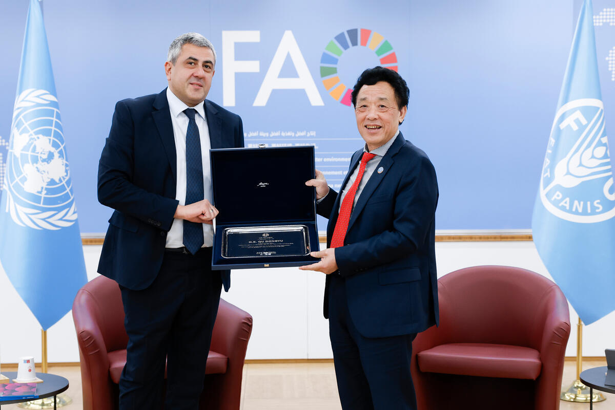 25 November 2025, Rome, Italy. FAO Director-General QU Dongyu (R) receives from UN Tourism Secretary General Zurab Pololikashvili, a Recognition plate for his outstanding contribution to tourism and rural development and his leadership in advancing FAO's Four Betters. FAO Headquarters (Iraq Room).