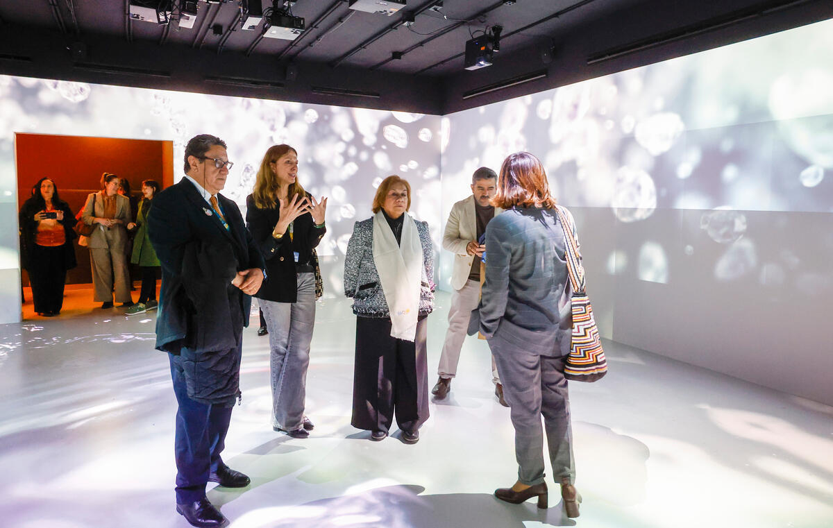 27 November 2025, Rome, Italy. FAO MuNE visit: Minister for Foreign Affairs of Colombia Rosa Yolanda Villavicencio Mapy (3rd from L) is briefed by Clara Velez, Chief Outreach and Promotions, FAO, as she visits the newly inaugurated Food and Agriculture Museum & Network (FAO MuNe). FAO Headquarters (MuNe).