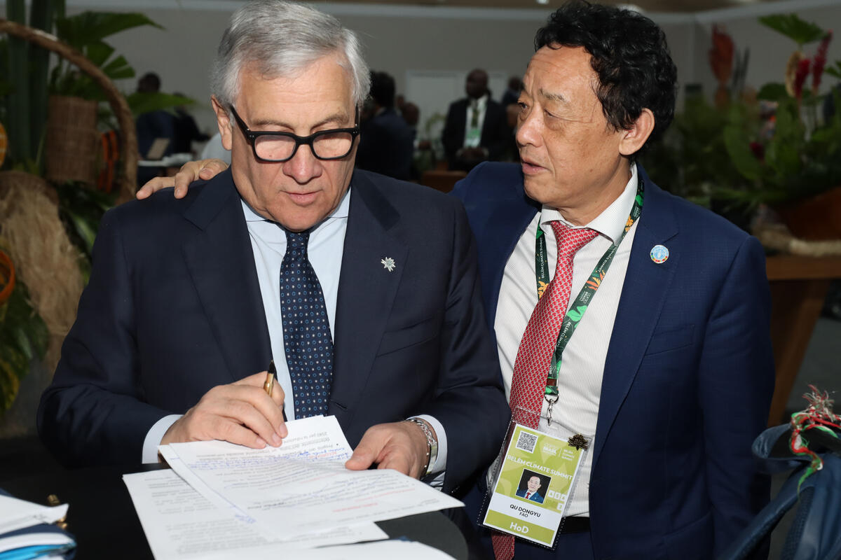 06 November 2025. Belém, Brazil.(L) Antonio Tajani, Deputy Prime Minister and Foreign Minister of Italy and FAO Director-General QU Dongyu (R). World leaders are gathering in Belém, Brazil, for the climate summit on 6 and 7 November, kicking off the 30th United Nations Climate Change Conference (COP30).