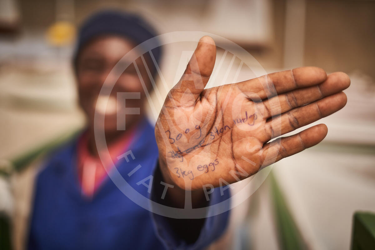 26 July 2022, Chinhoyi, Zimbabwe - Martha Magwaro, a Black-Soldier-Fly breeder at Chinhoyi University of Technology BSF plant, shows notes of quantities written on her palm.