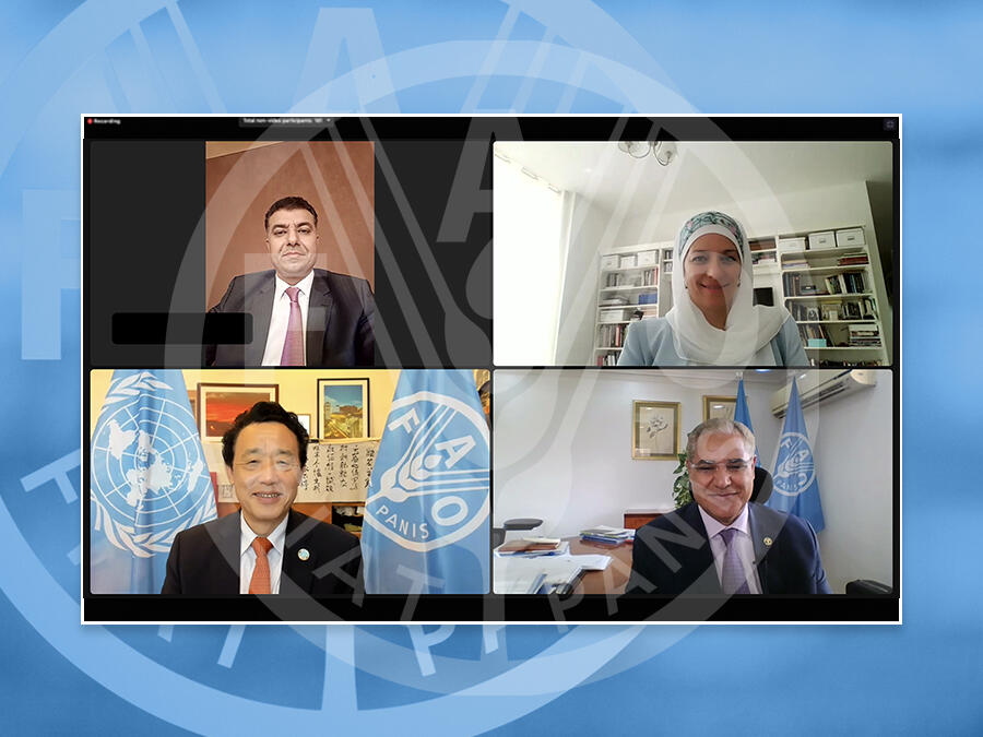 27 April 2022, Rome, Italy - Nomination ceremony - Her Royal Highness Princess Basma bint Ali, Jordan - FAO Regional Goodwill Ambassador (GWA) for Near East and North Africa. Khaled Hneifat, Minister for Agriculture of the Hashemite Kingdom of Jordan; Her Royal Highness Princess Basma bint Ali, Jordan; FAO Director-General QU Dongyu; ADG RNE, Abdulhakim Elwaer.
