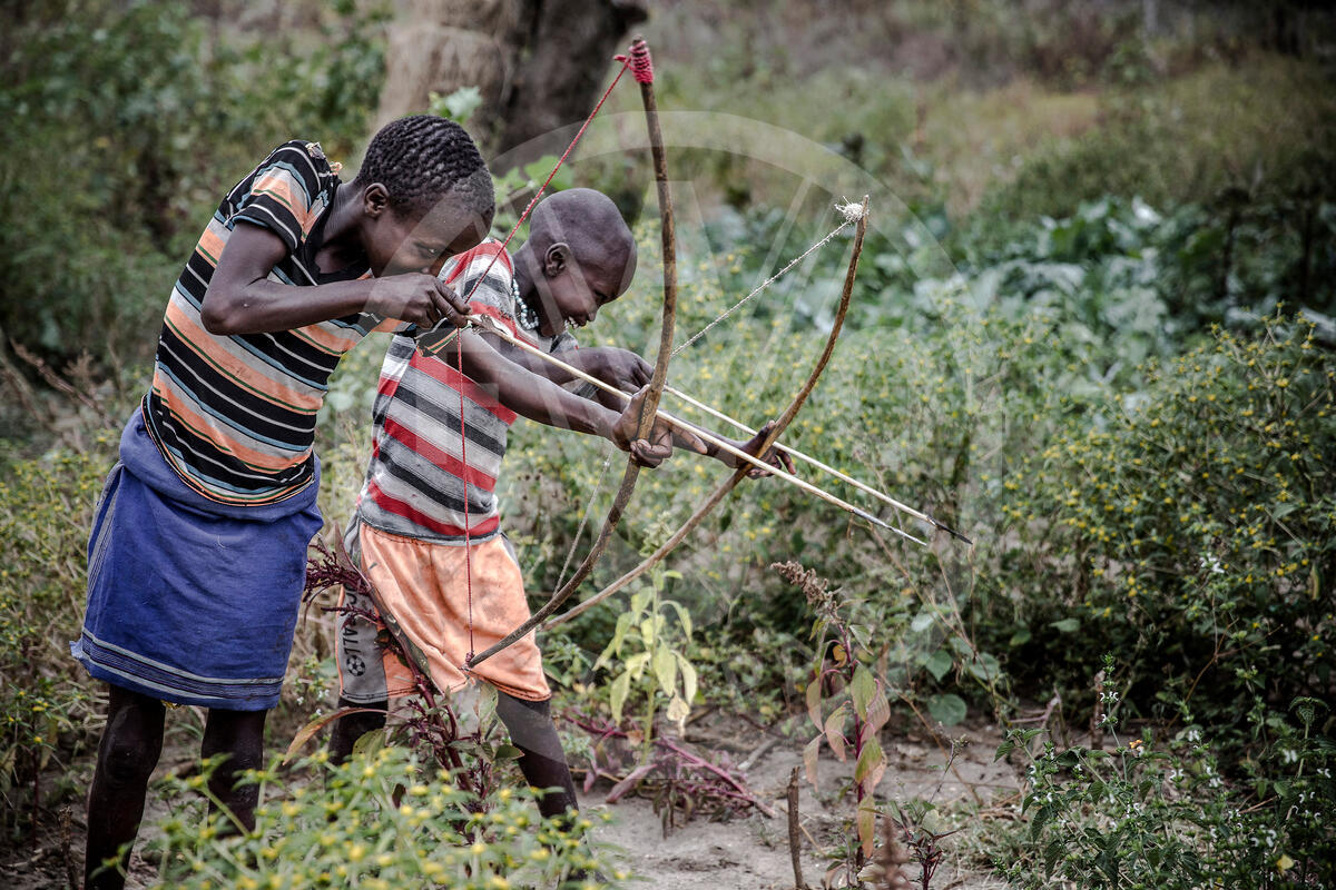 26 January 2020, Amudat, Uganda - Young pastoralist boys play with hand-crafted bows and arrows in Amudat, Uganda next to the Kenyan border on January 26, 2020. Bows and arrows are the traditional way of self-defense for pastoralist communities in the region.