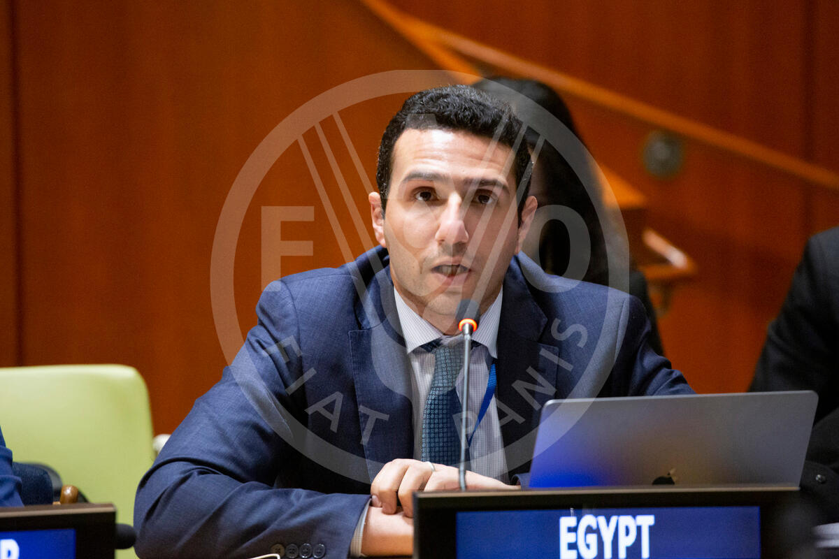 12 February 2020, United Nations, New York, NY, USA - The representative from Egypt speaks during Interactive Dialogue on "Targeting Hunger: South-South and Triangular Cooperation for Transforming Agriculture" event at the United Nations on February 12, 2020 in New York City.