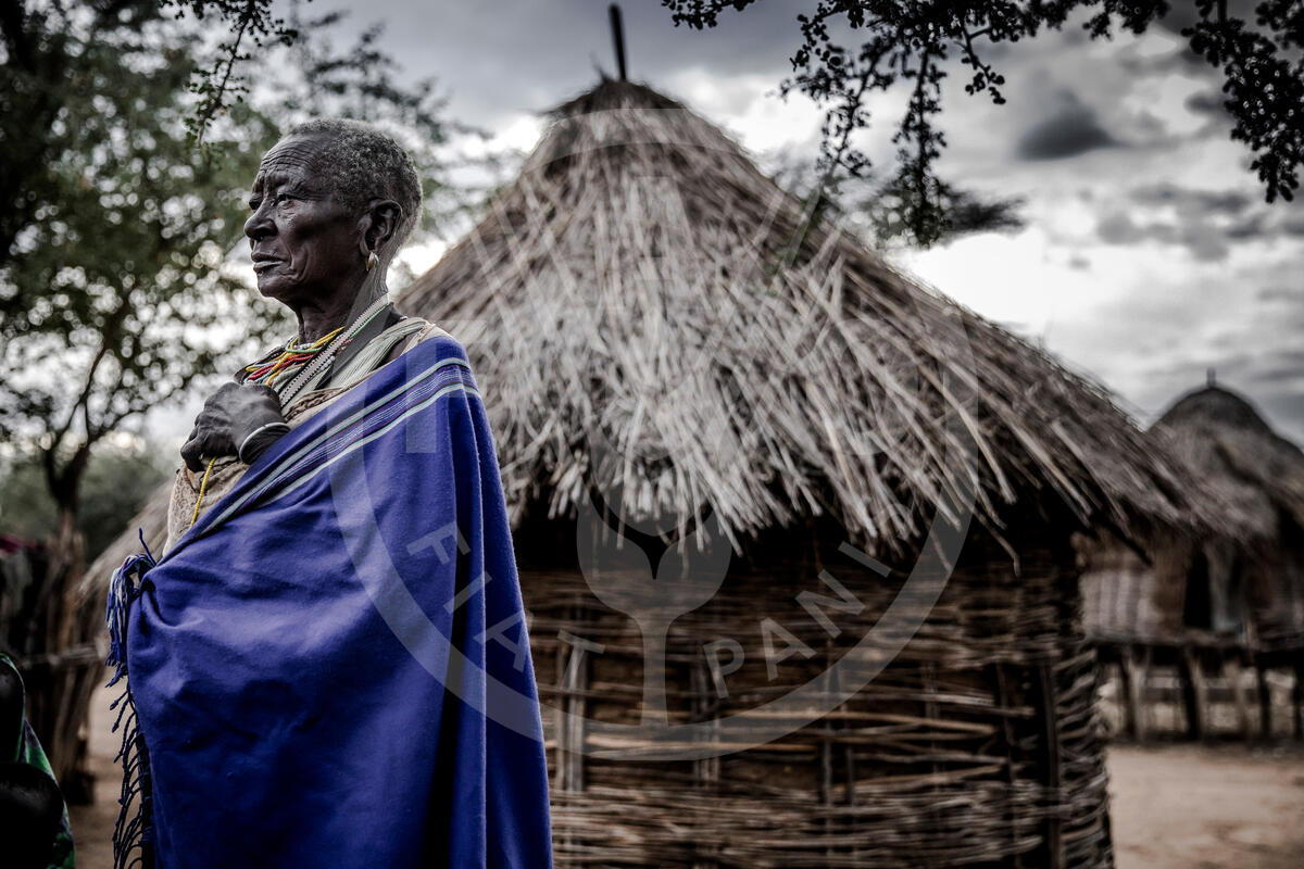 27 January 2020, Amudat, Uganda - 75-year-old pastoralist woman Mary Chapchai stands in front of her house in the village of Napao in Amudat, Uganda next to the Kenyan border on January 27, 2020.