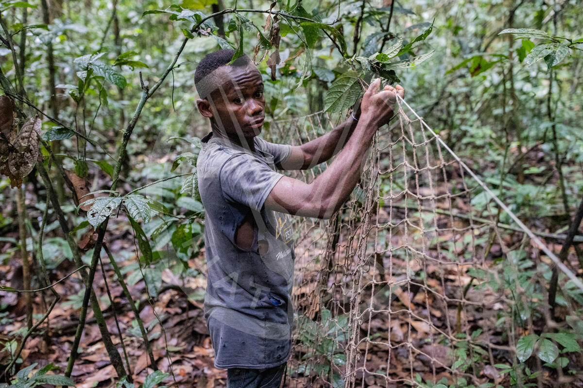 08 December 2020, Democratic Republic of Congo - Indigenous hunter Kikalo Biseni sets up his nets in order to catch animals in the Okapi Wildlife Reserve, Democratic Republic of Congo. Mbuti people use the traditional hunting nets to hunt animals.