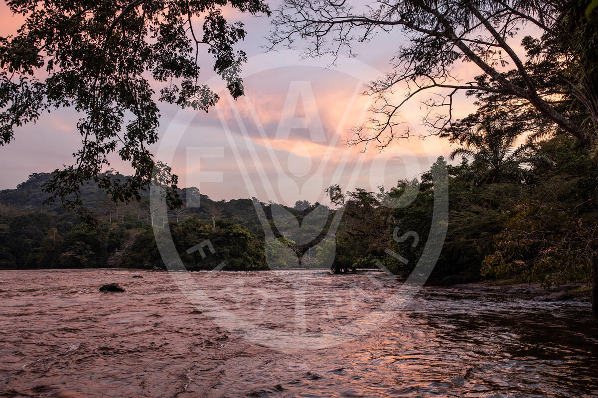 14 December 2020, Democratic Republic of Congo - Epulu river at sunset, Okapi Wildlife River, Democratic Republic of Congo. This protected area is a 13, 726-square kilometer World Heritage site located in an unstable area of the Democratic Republic of Congo. It is home to several endangered species such as chimpanzees, okapis and forest elephants.
