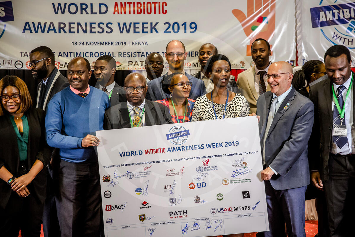 18 November 2019, Nairobi, Kenya - Speakers of the opening session pose for a group photo during The World Antibiotic Awareness Week Press Conference and Media Breakfast in Nairobi, Kenya on November 18, 2019. The World Antibiotic Awareness Week (WAAW) presents an opportunity to scale up the coordination and collaboration efforts between FAO, OIE and WHO to mitigate and contain the spread of AMR. The first regional WAAW is held in Nairobi, 18-24th November, 2019 with the goal of strengthening AMR coordination and collaboration in Africa.
