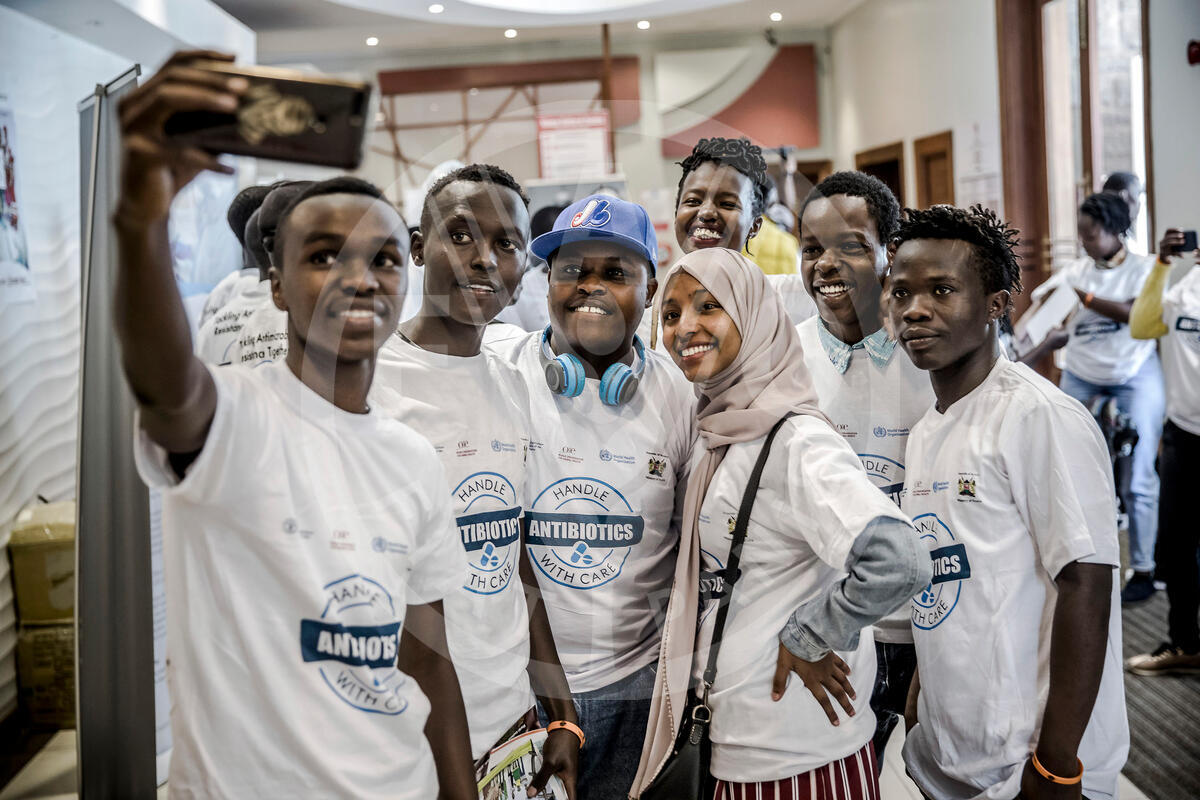 23 November 2019, Nairobi, Kenya - Students take pictures and selfies at the entrance of the venue during The World Antibiotic Awareness Week Student Day in Nairobi, Kenya on November 23, 2019. The World Antibiotic Awareness Week (WAAW) presents an opportunity to scale up the coordination and collaboration efforts between FAO, OIE and WHO to mitigate and contain the spread of AMR. The first regional WAAW is held in Nairobi, 18-24th November, 2019 with the goal of strengthening AMR coordination and collaboration in Africa.