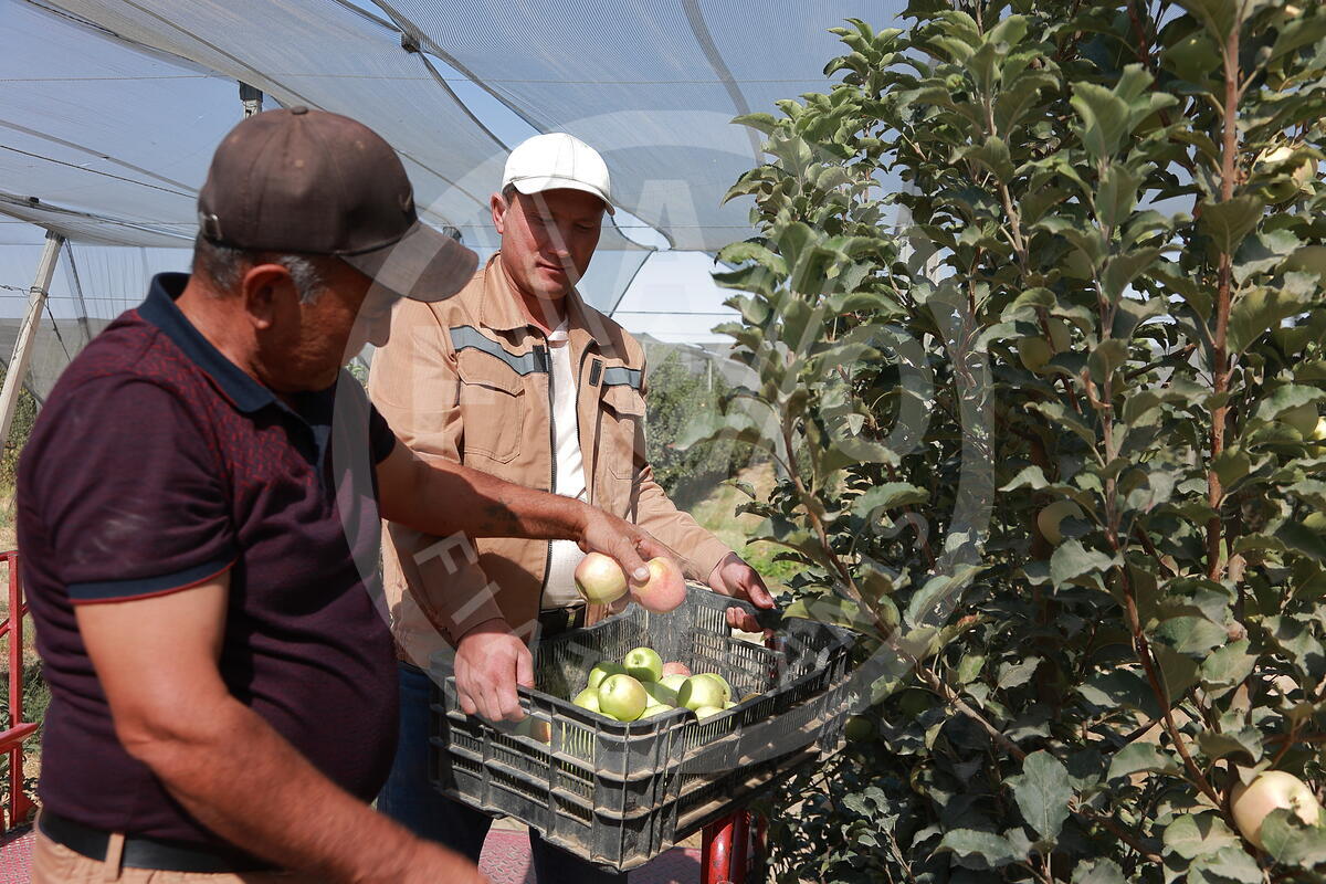 21 September 2022, Jizzakh region - Employees of the fruit producing company harvests apple at the orchard in Central Uzbekistan.