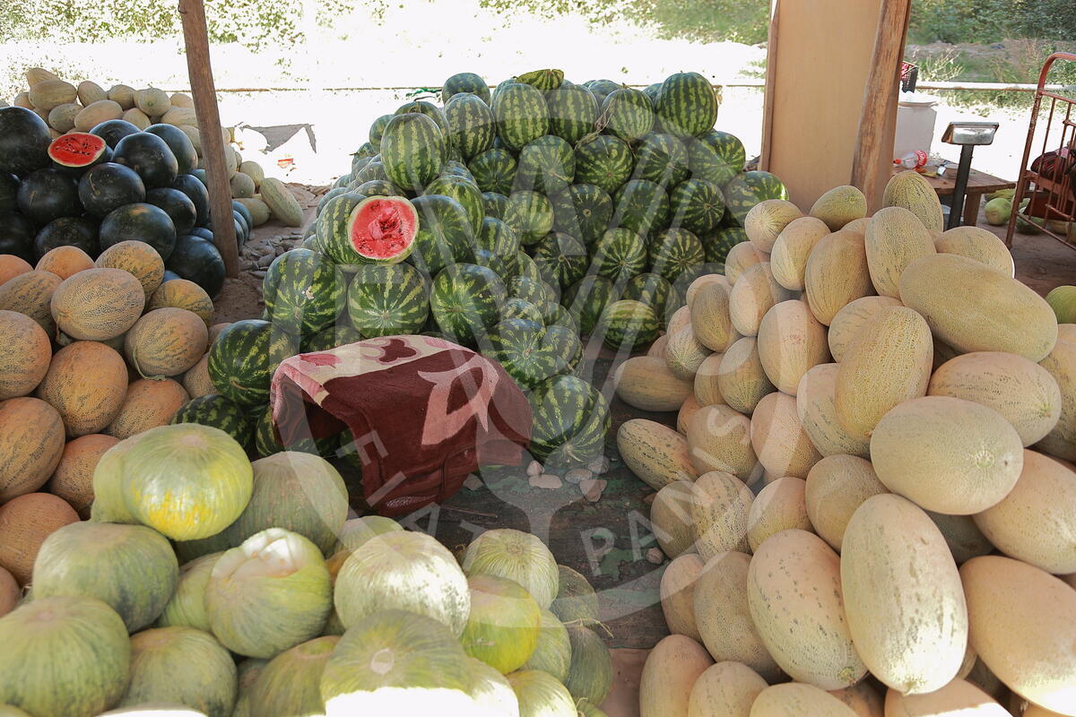 21 September 2022, Jizzakh region - Melons, a popular fruit in Central Asia, sold along the road in rural Uzbekistan, including the Torpeda and Kassaba varieties.