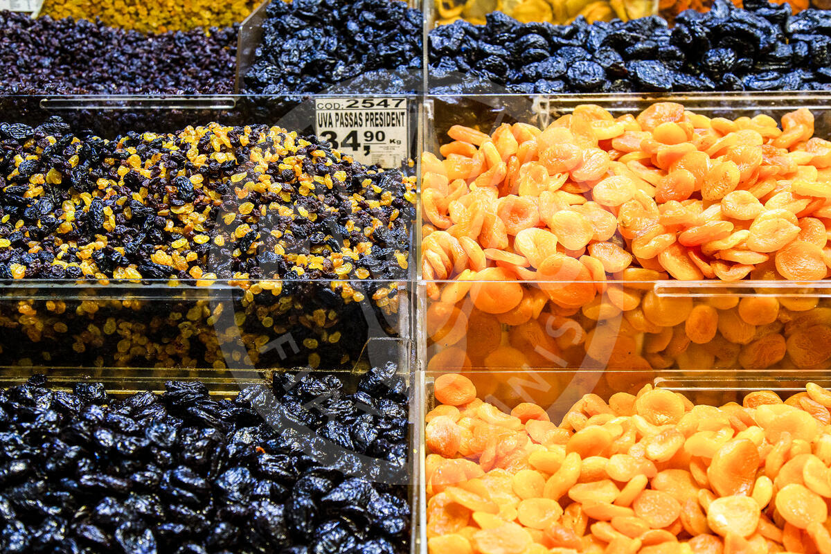 June 26, 2019, Sao Paulo, Brazil - Dried fruits are displayed on sale in a stall at the municipal market in Sao Paulo.