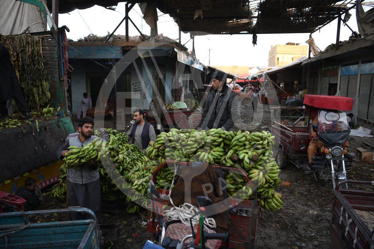 26 October 2020, Mazar-i-Sharif, Afghanistan - Fruit merchants offload banana piles from a truck at a fruit market in Mazar-i-sharif, Afghanistan.