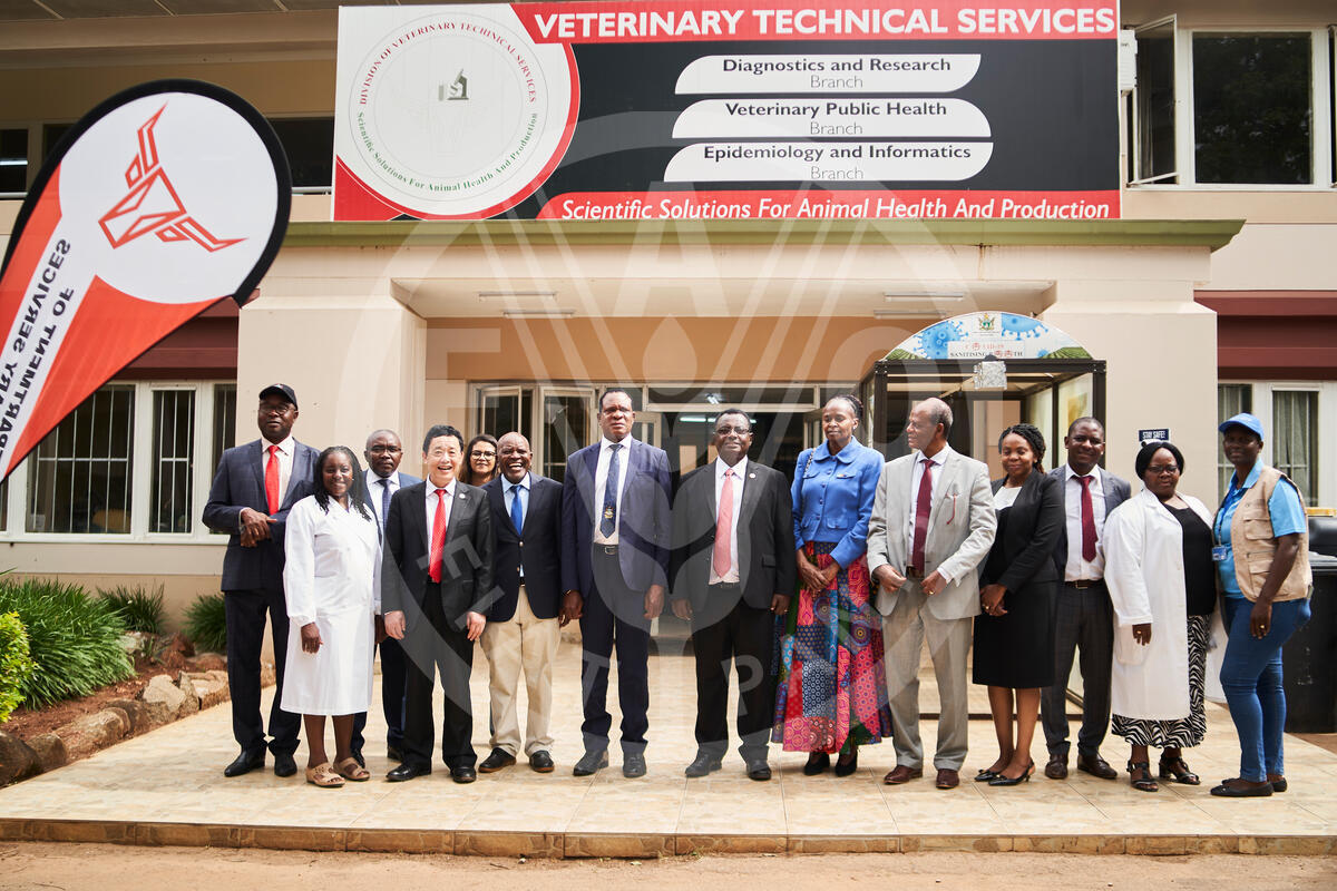 22 February 2023, Harare, Zimbabwe - FAO Director-General QU Dongyu take part in a group photo with ministers and staff at the offices of Central Veterinary Laboratory. ©FAO/Zinyange Auntony