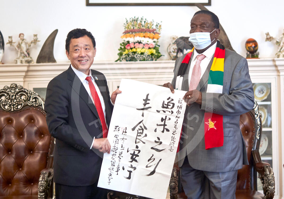 22 February 2023, Harare, Zimbabwe - FAO Director-General QU Dongyu present a gift to Zimbabwe President, Emmerson Mnangagwa during a visit to the State House. ©FAO/Zinyange Auntony