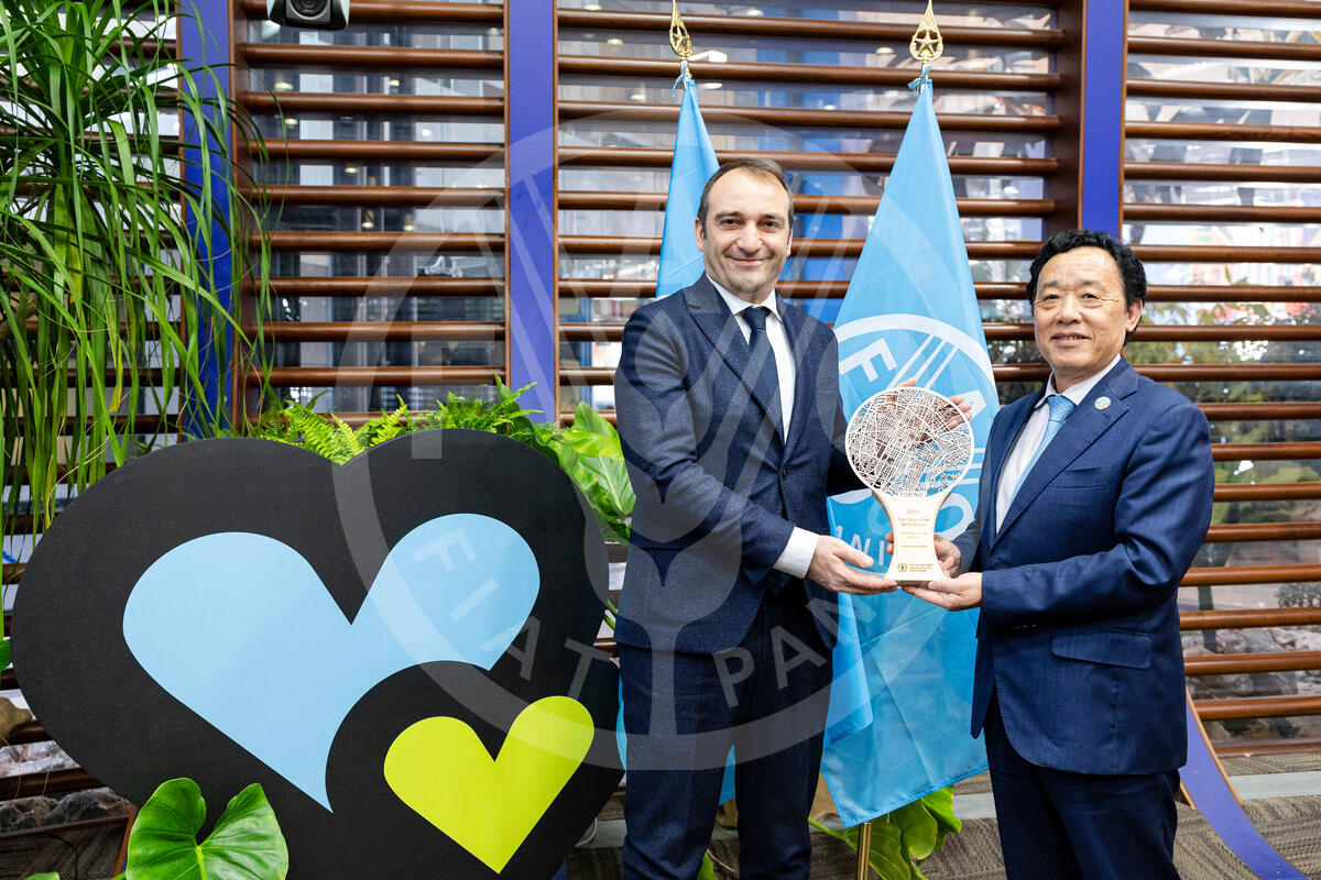 21 March 2023, Rome, Italy - FAO Director-General QU Dongyu awards Stefano Lo Russo, Mayor of Turin, with the FAO Tree Cities of the World Award. High level event: International Day of Forests. FAO headquarters, (Sheik Zayed Centre).