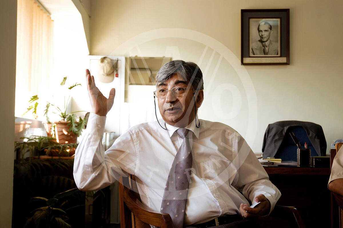 Plant pathologist and Head of the National Integrated Pest Management (IPM) Programme Dr Iftikhar Ahmad giving an interview about IPM and the Farmer Field Schools (FFS). Pakistan Agricultural Research