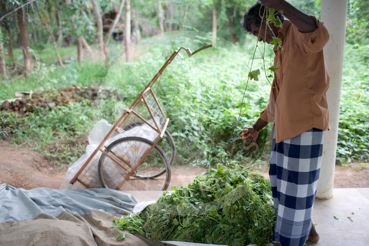 A Telefood Oil Extraction and Medicinal Herb Project beneficiary harvesting an herb called dummella. The herbs are dehydrated and sold for Ayurvedic medicine as well as natural beauty products in Sri