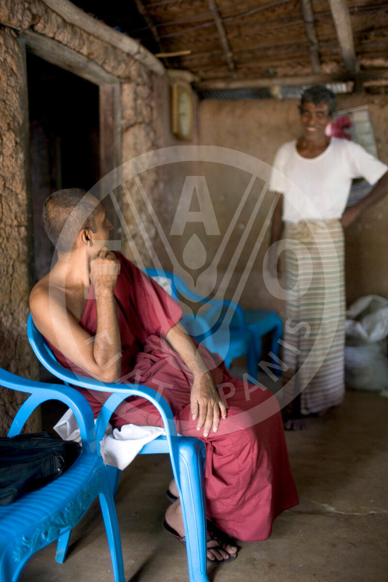 SRI LANKA 2005. A monk visiting a family of Telefood Oil Extraction and Medicinal Herb Project beneficiaries.