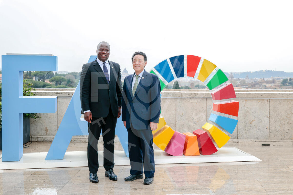26 March 2024, Rome, Italy - FAO Director-General QU Dongyu meeting with Samuel Abdulai Jinapor, Minister for Lands and Natural Resources of Ghana. FAO headquarters, (FAO terrace).