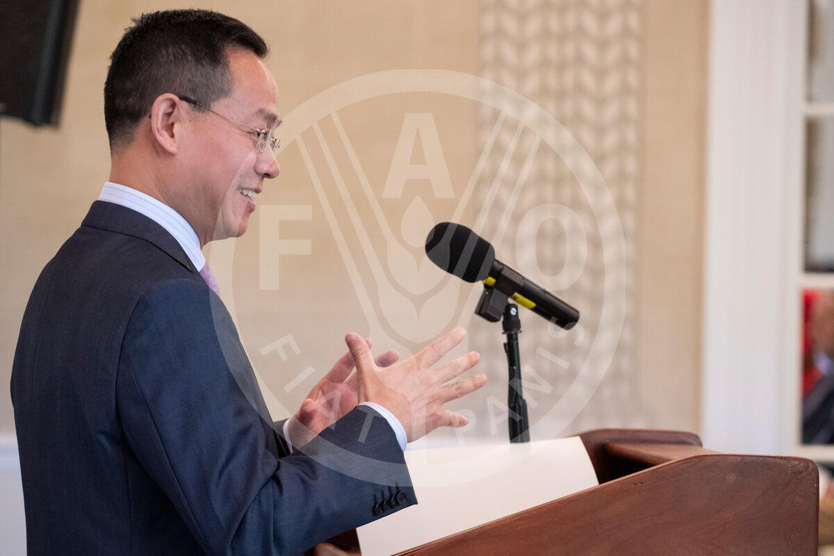 16 October 2023, New York City, NY - Guangzhou QU, FAO New York Liaison Office Director speaks during the World Food Day (WFD) event at the New York Botanical Garden (NYBG) in New York City, NY, USA. The Food and Agriculture Organization of the United Nations and the New York Botanical Garden (NYBG) host an event bringing together UN Permanent Representatives, New York City representatives and other local partners to celebrate "Water is Life, Water is Food. Leave no one behind." and highlight the connection between urban food systems and food security, and the linkages to water.