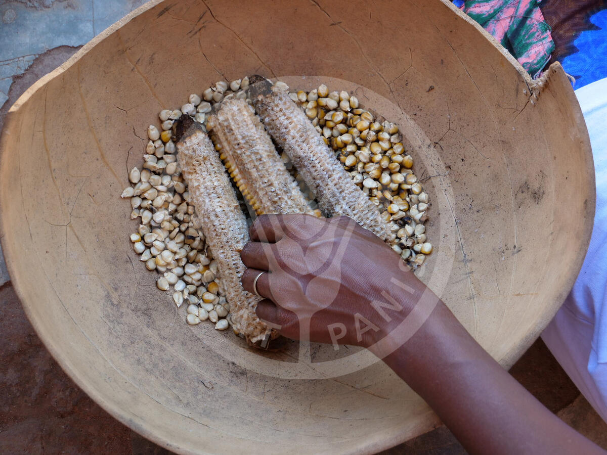 13 July 2023 - Kenya Village, Bafata, Guinea Bissau - A hand with maize cobs in a bowl, maize kernels underneath.