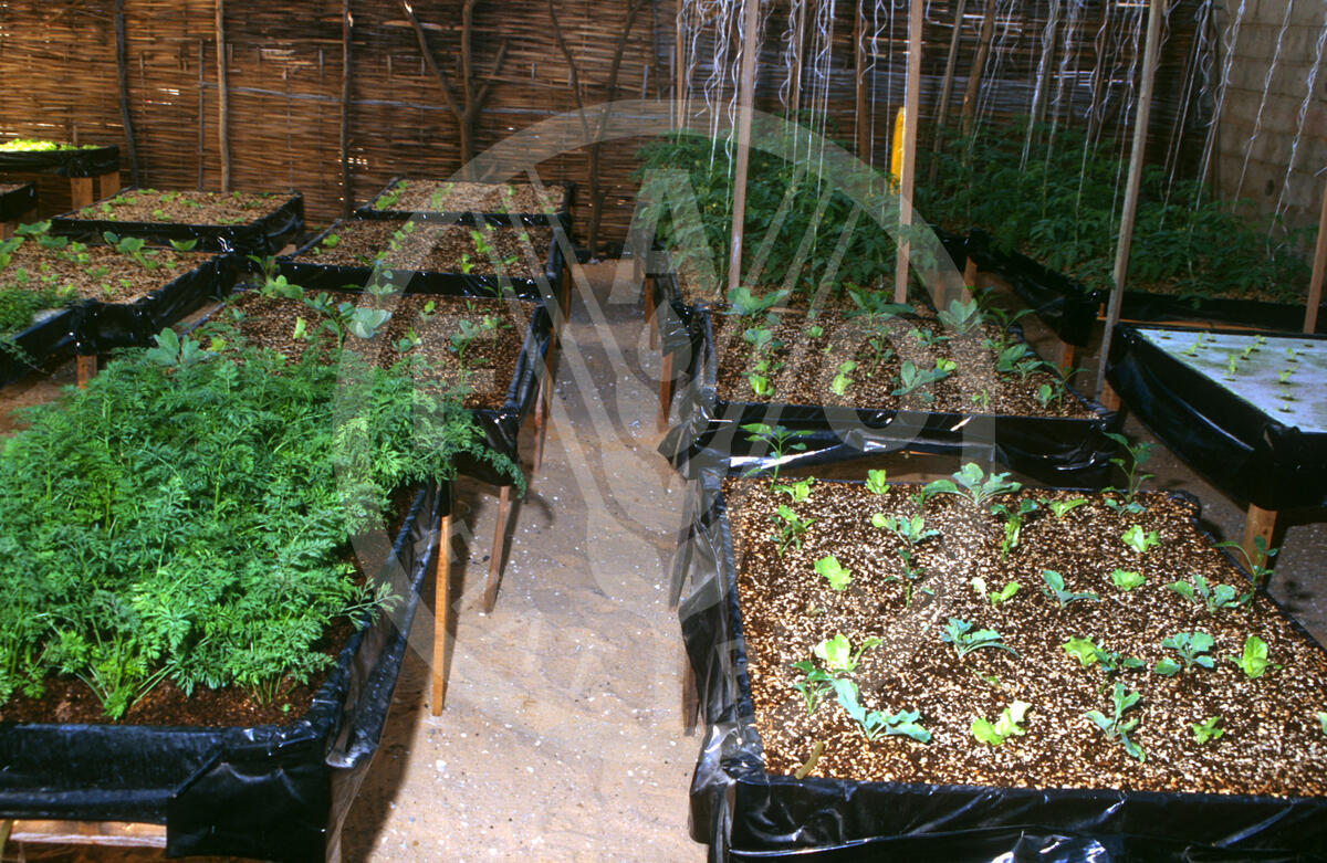 Undated Photo: Successful planting on a solid growth medium (gravel, rice husks and groundnut shells). Carrots and cabbages are grown in combination with lettuce on the left and right, respectively. The crops are produced in micro-gardens on roof terraces. As agricultural land has been depleted and areas available for cultivation have become scarce, new technology has been introduced to enable the most affected communities to grow their own vegetables in containers, on roof terraced, in courtyards, and on any small, collective parcel of land available. - - Special Programme for Food Security. In December 1999, Dr Jacques Diouf, Director General of the Food and Agriculture Organization of the United Nations (FAO) led a delegation, including FAO Ambassador, Ms Dee Dee Bridgewater, to visit sites and activities of the programme.