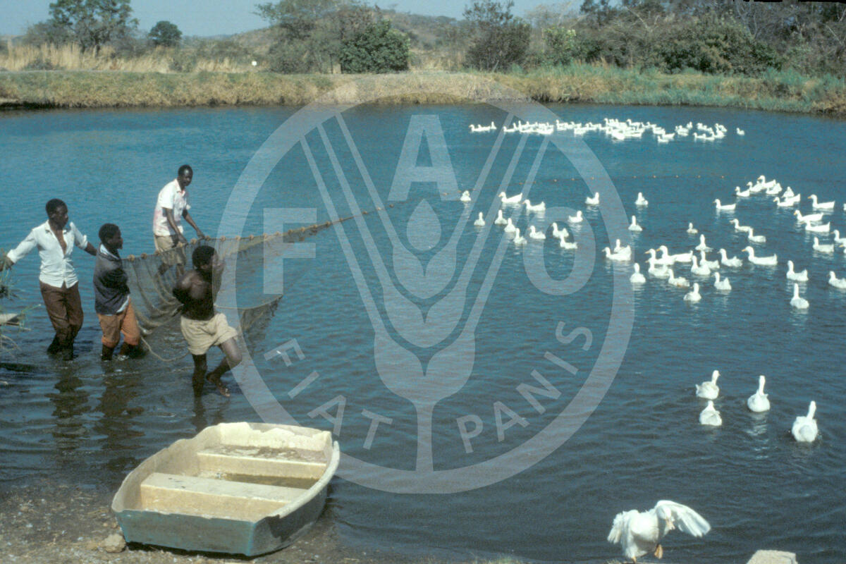 1981-86. Chilanga, Zambia. Pekin ducks are integrated into the semi-intensive earthen fish breeding ponds at the Chilanga fish farm.